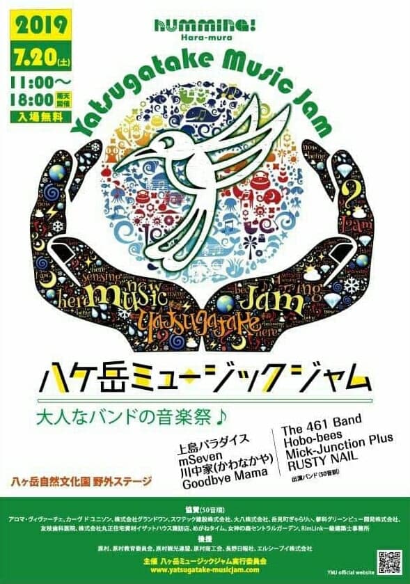 八ヶ岳ミュージックジャム 7月20日(土)、今年も大人なバンドの音楽祭、「八ヶ岳ミュージックジャム」が開催されます! 11:00 – 18:00 入場無料(雨天決行)です。 お誘い合わせの上、八ヶ岳自然文化園のコンサート広場、野外ステージにお越しください!