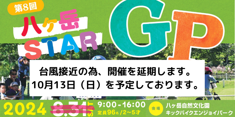 8月31日(土)に開催を予定しておりました「第8回 八ヶ岳STARGP」ですが、台風接近の予報を受けまして、参加者の皆様の安全を考慮した結果、延期とさせていただきますのでお知らせいたします。楽しみにして頂いておりました参加者の皆様には、多大なご迷惑をおかけしますことともに、直前のご案内となりました事を心より深くお詫び申し上げます。なお、延期後の日程といたしましては、10月13日(日)を予定しております。今大会にお申込みいただいた方には、大変お手数おかけしますが、新しいイベントページにて改めてお申込みをお願い致します。