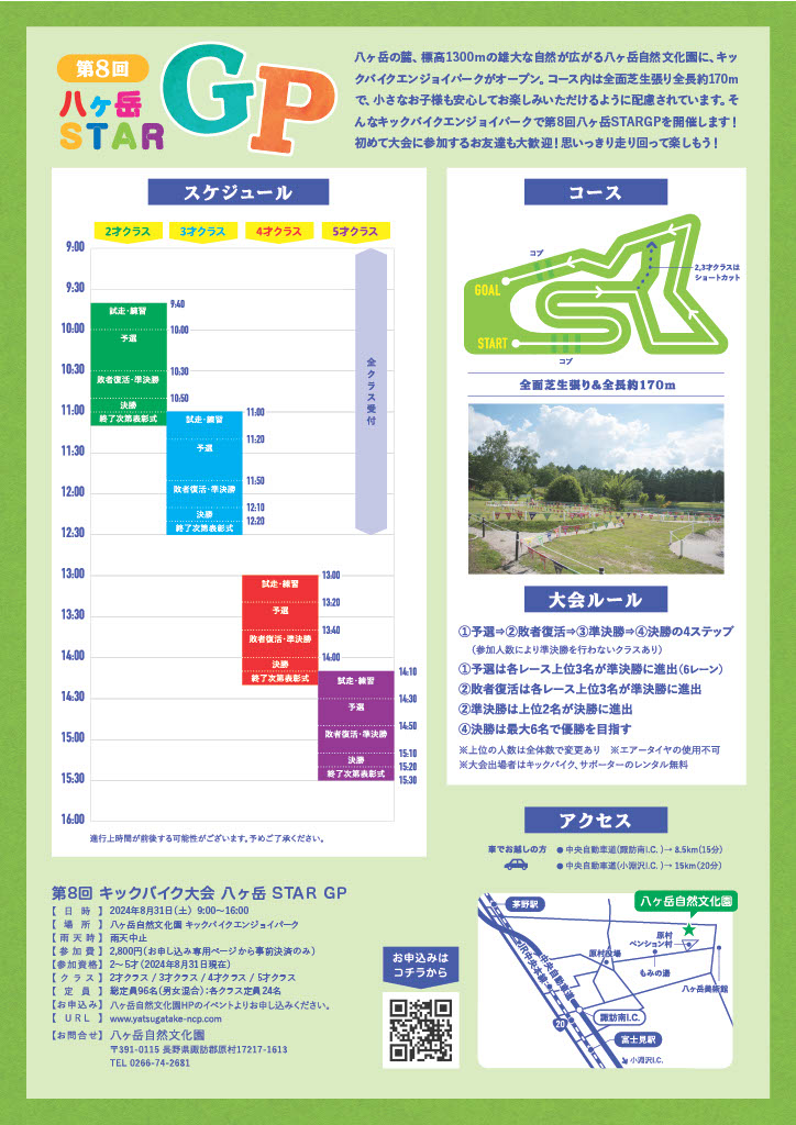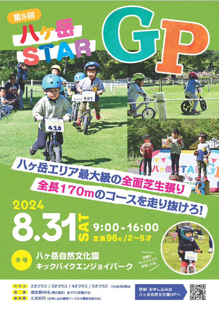 八ヶ岳の麓、標高1300mの雄大な自然が広がる八ヶ岳自然文化園に、キックバイクエンジョイパークがオープン。コース内は全面芝生張り全長約170mで、小さなお子様も安心してお楽しみいただけるように配慮されています。そんなキックバイクエンジョイパークで第8回八ヶ岳STARGPを開催します!初めて大会に参加するお友達も大歓迎!思いっきり走り回って楽しもう!皆様のご参加お待ちしております♪