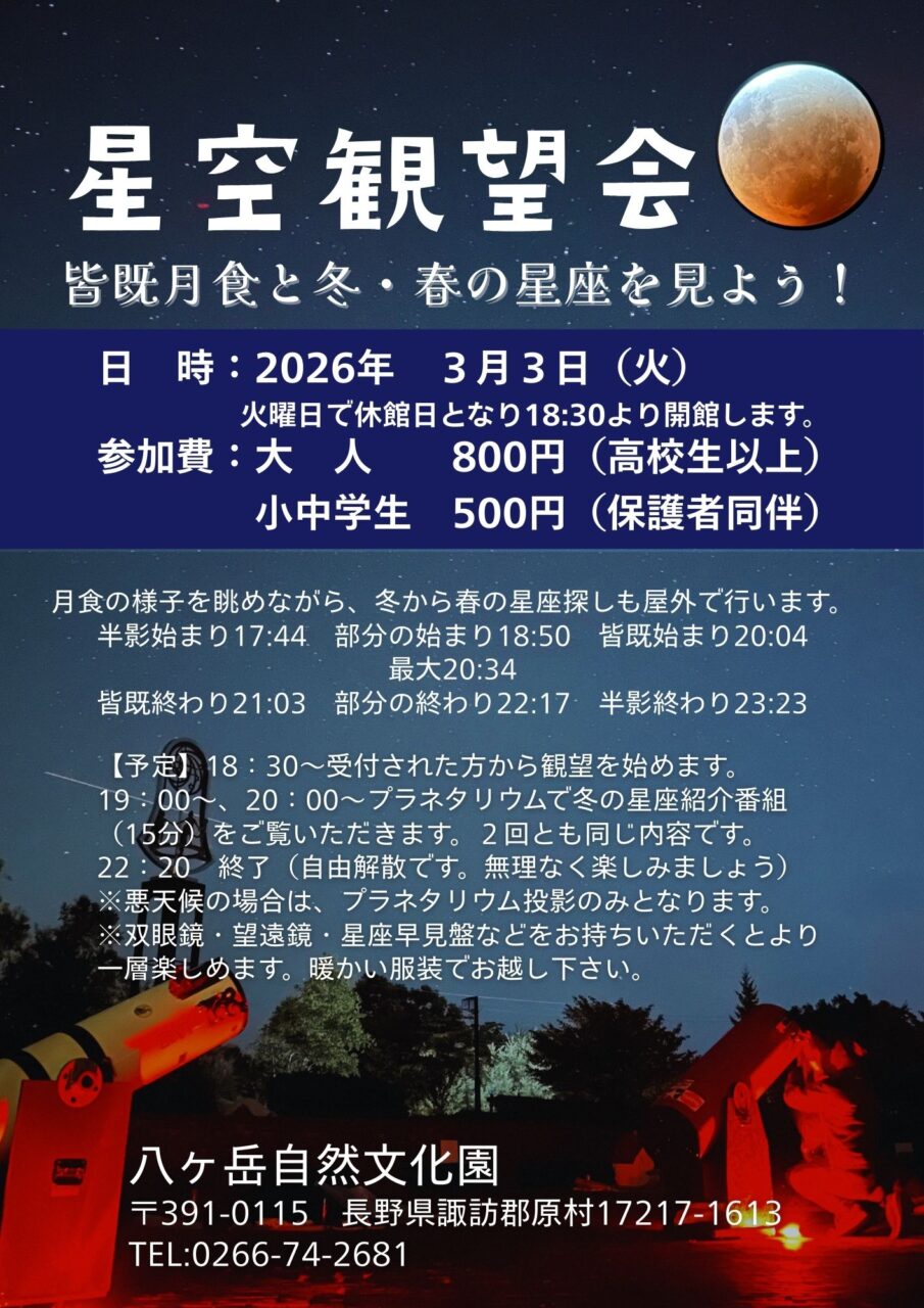 星空観望会(2026/3/3) 2025年3月3日(火)、星空観望会を開催します。 昨年9月にもあった「皆既月食」をみましょう! 場所 八ヶ岳自然文化園 受付や開始時間などの詳細は決定次第お知らせいたします。 真冬ですので、暖かい服装でお出かけください。 参加お一人800円 子供500円(予約不要) お気をつけてお出かけください。