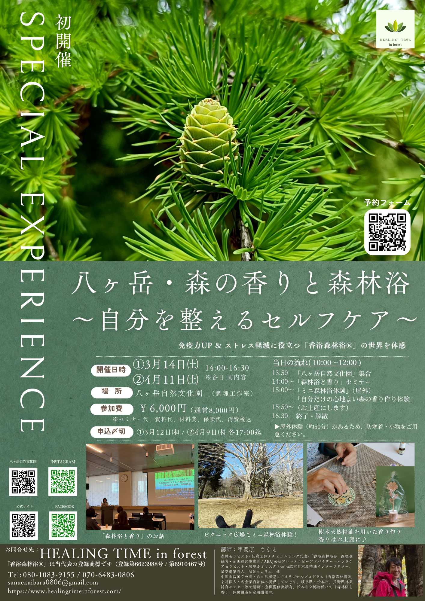 免疫力UPやストレス軽減に役立つ「香浴森林浴®」の世界を体感する、スペシャルな体験講座です。 八ヶ岳の豊かな自然の中で、心と体を整えるひとときを過ごしませんか?